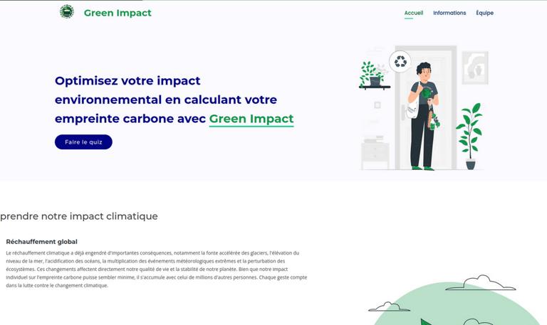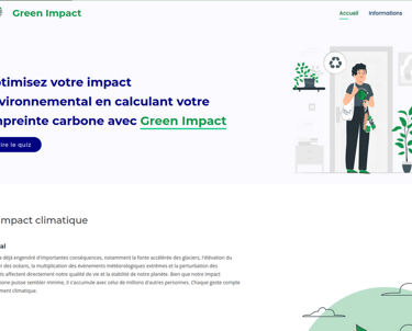 Dans le cadre du projet "Green Impact", réalisé en équipe de 6 personnes, j'ai été chargé de créer et de maintenir une base de données en utilisant des APIs ou des données open-source afin de calculer l'empreinte carbone des utilisateurs. Cette base permettait de recueillir et d'analyser des données environnementales afin d'évaluer l'impact écologique des activités. En parallèle, j'ai également développé le front-end de l'application, assurant une interface utilisateur intuitive et interactive pour visualiser les résultats et suivre les efforts de réduction d'empreinte carbone.