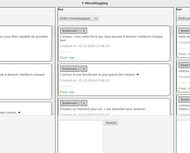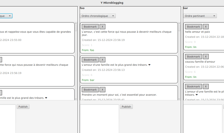 Développement d'un réseau social de microblogging similaire à X (anciennement Twitter) offrant deux modes de navigation: chronologique et par score, pour personnaliser l’affichage des messages. Le mode basé sur le score utilise des critères définis (pertinence, date, mots-clés) pour afficher les messages les plus intéressants. L’application inclut un système de scrolling progressif et la possibilité pour les utilisateurs de ‘favoriser’ un message, le maintenant en haut de leur fil. Les utilisateurs peuvent aussi publier, supprimer et gérer leurs messages en temps réel sur plusieurs appareils.8